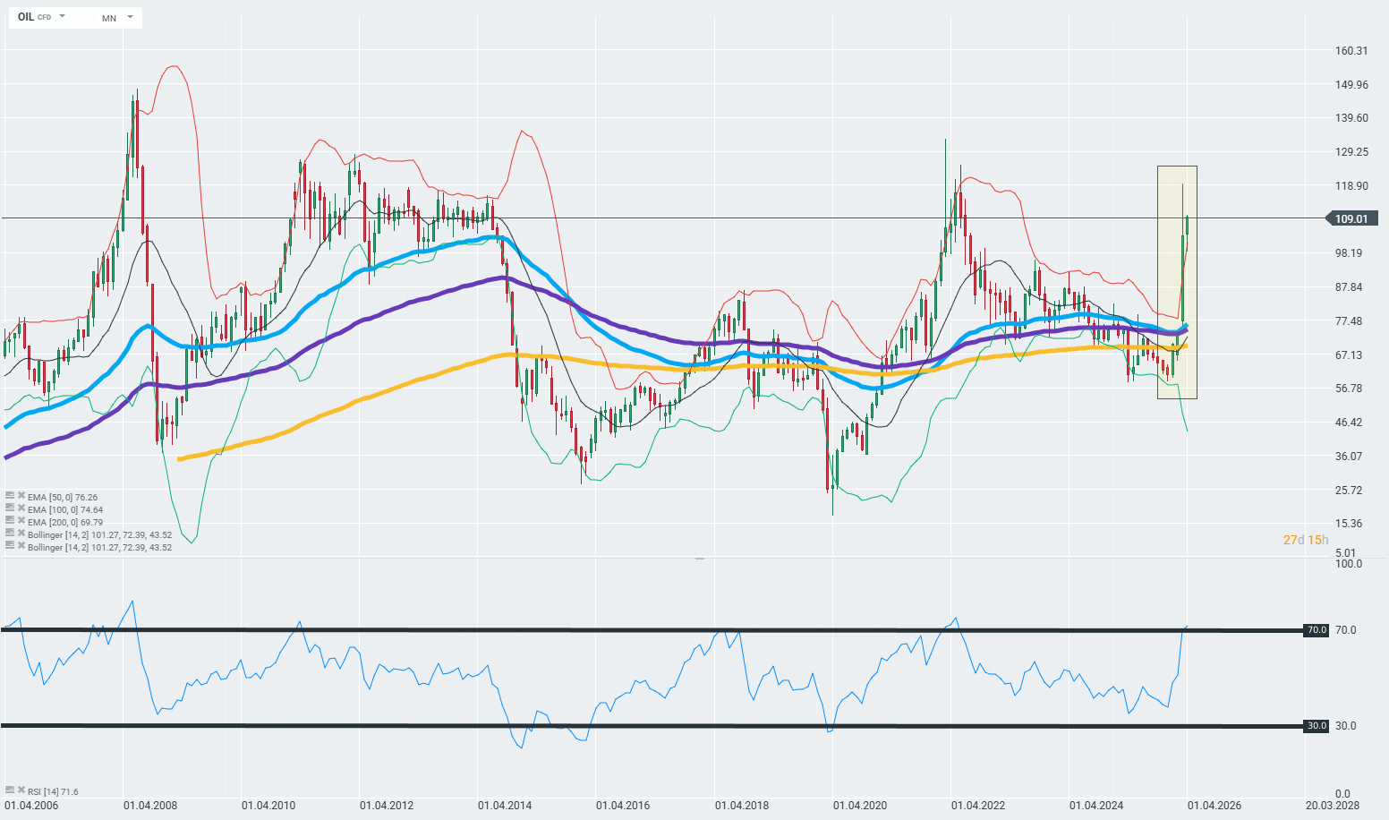 On the monthly timeframe, the oil (OIL) chart shows a vertical surge from around $60 to the current ~$109 over the course of 1–2 monthly candles—a rise so steep that it is unprecedented in the chart’s entire 20-year history, surpassing even the growth rate seen in 2008 or the COVID-19 rebound of 2020 –2022. The price has broken above the upper Bollinger Band (101.27), which on the monthly time frame is an extreme overbought signal. The RSI(14) currently stands at 71.6—freshly in overbought territory above the 70 level; on the monthly timeframe, similar or higher RSI readings have preceded multi-month corrections (2008, 2011–2012, 2022), though over varying time horizons. From a historical perspective, a key technical level could be resistance around $118–120, where the peaks from 2011–2014 were located; a break above this area could open the door to the all-time highs from 2008 (~$147–150). On the other hand, the round number of $100 per barrel may remain a key support level. Source: xStation