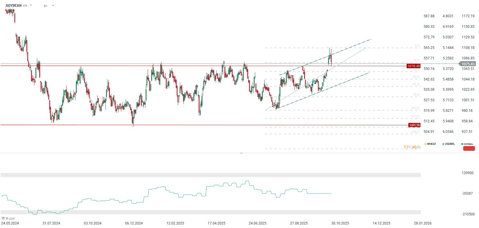 Soybean prices have been rising since mid-October, and trading opened with a gap-up at the start of this week, reaching peaks near 1,100 cents per bushel—the highest level in 15 months. However, the price is reacting negatively following China’s declaration. It is worth recalling that the 2020 declaration of strong purchases of soybeans and other agricultural products was never fully fulfilled. Until the details of the agreement are released, such as a full purchase schedule, investors may choose to book more profits. The position of speculators is also unknown; immediately before the US government shutdown, speculative investors maintained a net short position in soybeans.