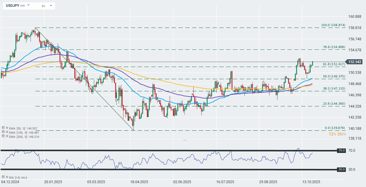 The USDJPY pair remains around 152.50, recovering from losses after the recent strengthening of the yen, which reacted to the outcome of the vote in the Japanese parliament and Sanae Takaichi taking office as prime minister. Investors assume that the new government, based on a coalition between the LDP and the Ishin party, will introduce an expansionary fiscal package exceeding USD 90 billion, which may allow the Bank of Japan to further delay interest rate hikes.