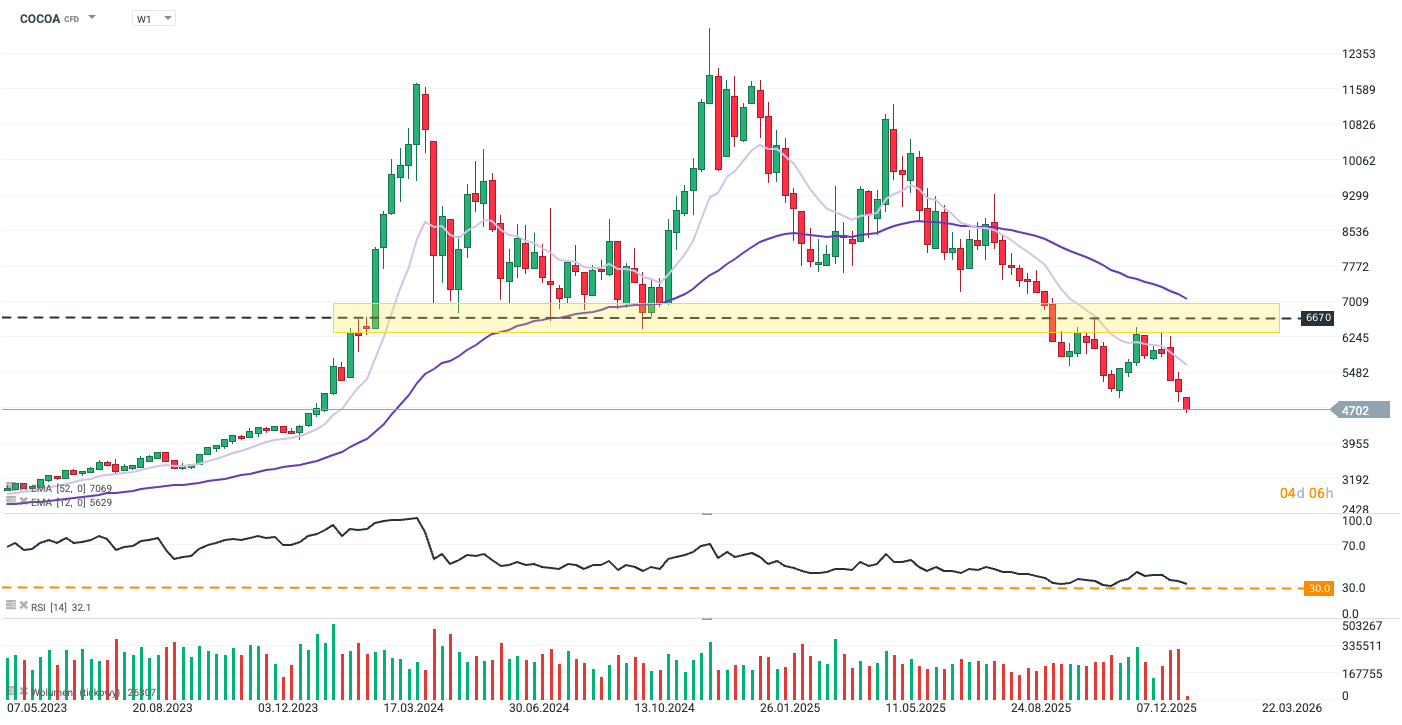 Cocoa prices collapsed on the London exchange by approx. 9%, diving below $5,000 per ton to their lowest level in two years. The unprecedented selling pressure is the result of both weakening demand and a significant improvement in harvests in East Africa.