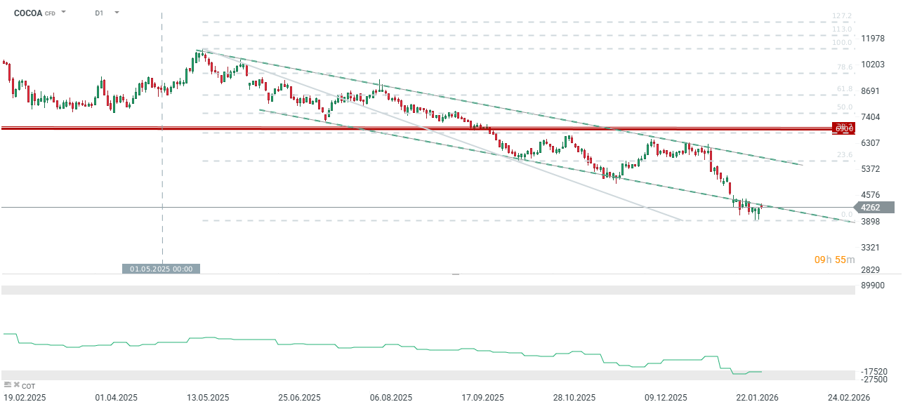 Prices briefly fell below $4,000 per tonne but are showing signs of a slight recovery. A return above the lower limit of the descending trend channel could target $5,000, followed by $5,700 at the 23.6% retracement. Conversely, fresh selling pressure could target the $3,400–$3,500 demand zone. Source: xStation5