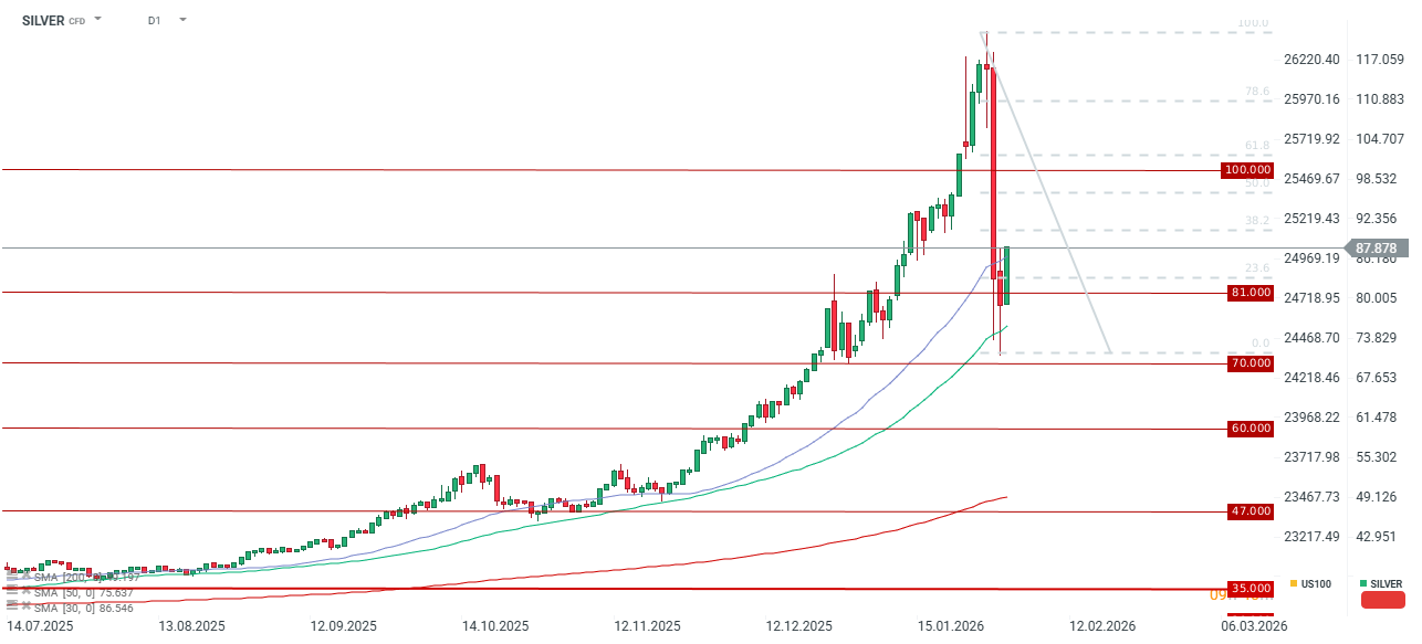 A price close above $85 may suggest a bullish engulfing pattern on the chart. Key resistance lies near $100, between the 50% and 61.8% retracement of the latest downward wave. The price rebounded from the zone between the 25 and 50 SMAs, mirroring the October correction, though the current percentage move is more than twice as large. Source: xStation5