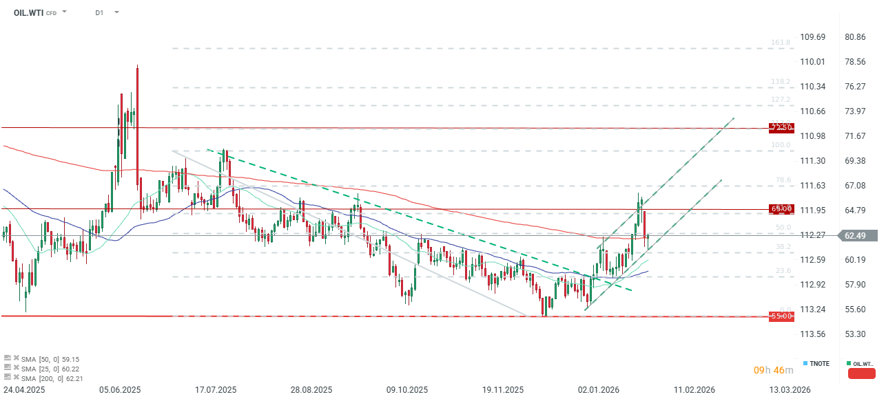 Crude prices are attempting a recovery following a highly negative opening in early February. The lower boundary of the ascending trend channel remains intact. Source: xStation5
