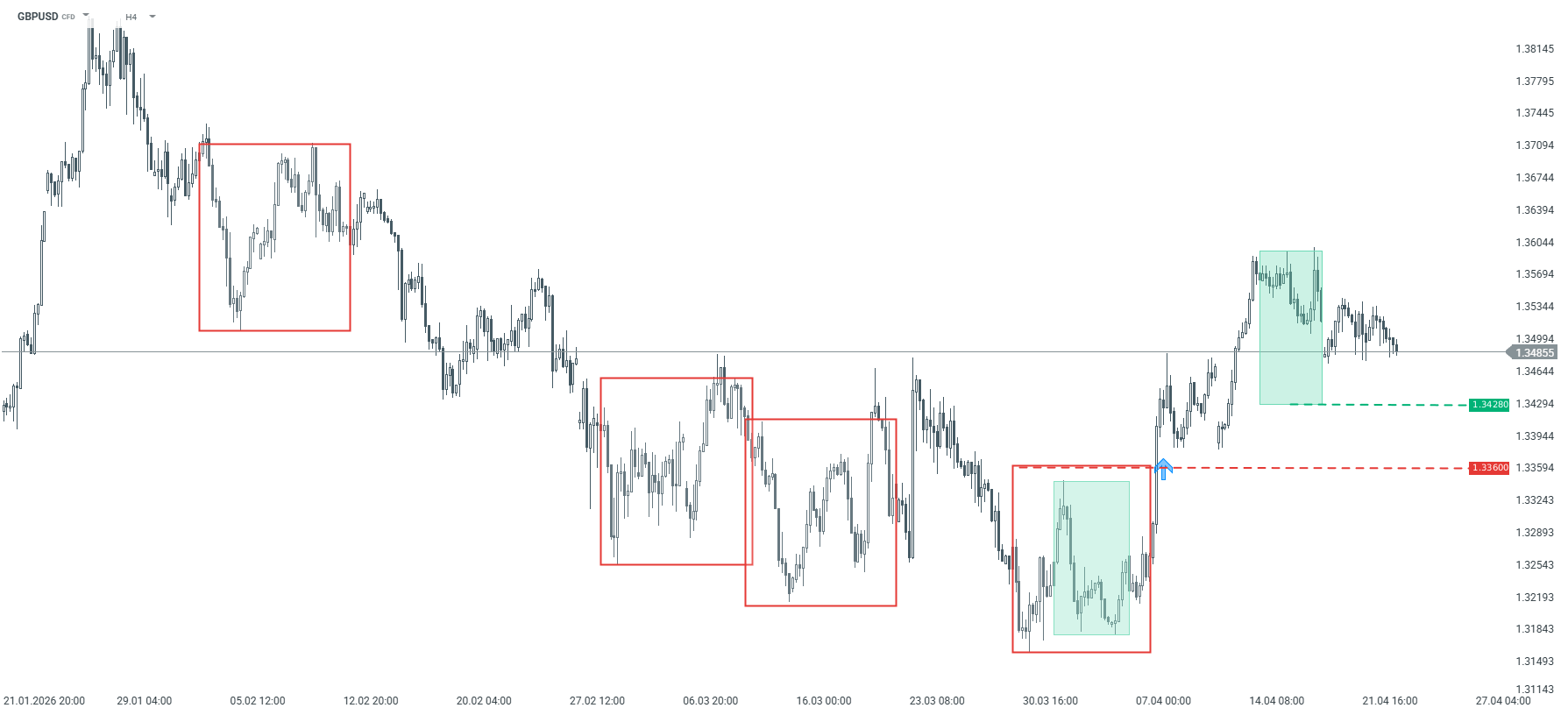 EURUSD – H4 chart. Source: xStation GBPUSD The GBPUSD pair is showing a situation very similar to that of the EURUSD. An uptrend has been in place since late March, but a correction has emerged in recent days. Should this correction deepen, the key support level remains at 1.3428. A break below this level could open the way for declines, which would be confirmed upon a drop below 1.3360—the polarity of the previously negated 1:1 downward geometric pattern.
