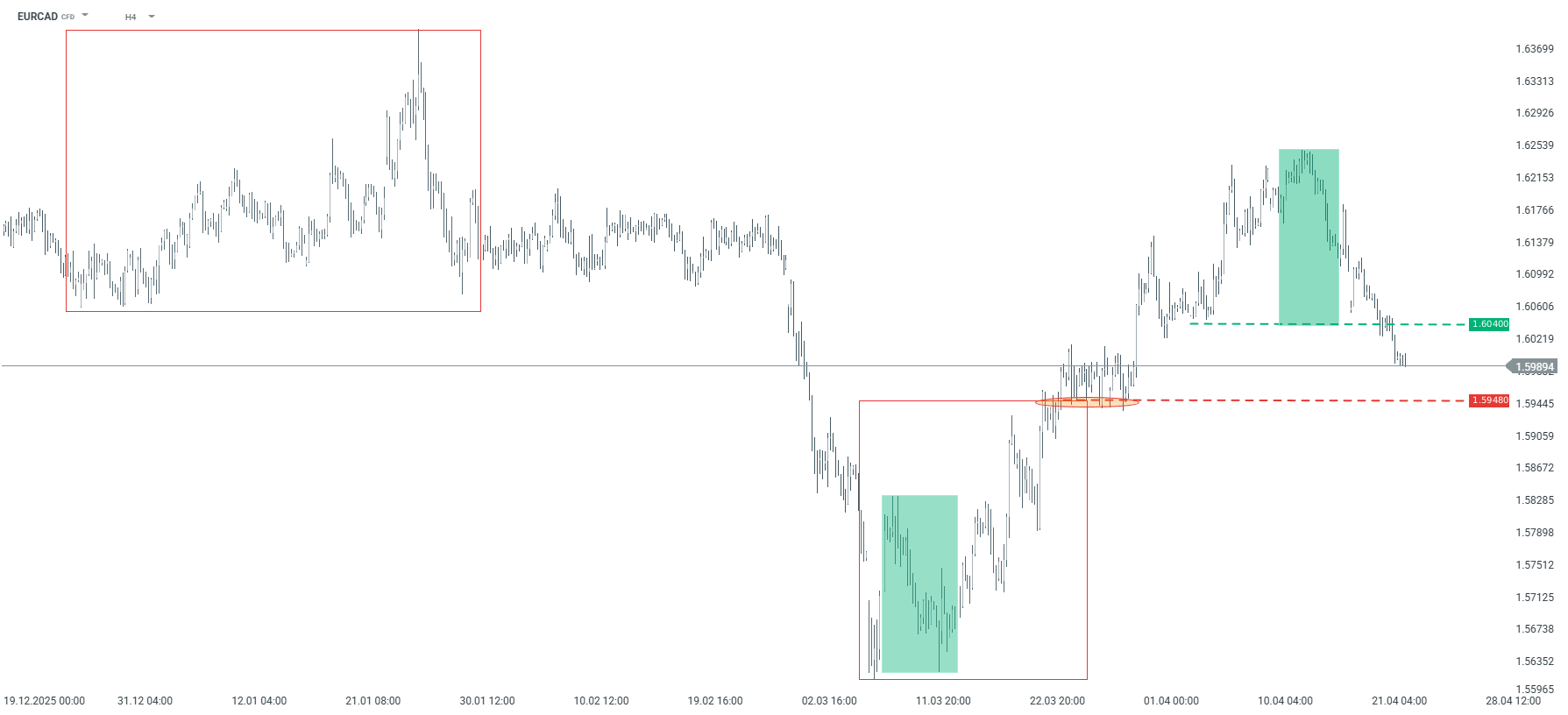 The Overbalance analysis aims to identify three financial instruments, analyzed primarily on the daily/four-hour (D1/H4) timeframe. The analysis uses only the Overbalance methodology, which helps determine where a trend may continue or where it may reverse. Today’s analysis covers three instruments, evaluated solely in terms of 1:1 correction structures EURCAD Since March 10, EURCAD has been trading in an uptrend; however, during yesterday’s session, the local 1:1 bullish pattern was negated at the 1.6040 level. According to the Overbalance methodology, this may support a scenario involving a return to the downtrend. Further confirmation would be a return of the price below the 1.5948 level, i.e., back into the previous downtrend. On the other hand, a break above 1.6040 could restore the bullish scenario.