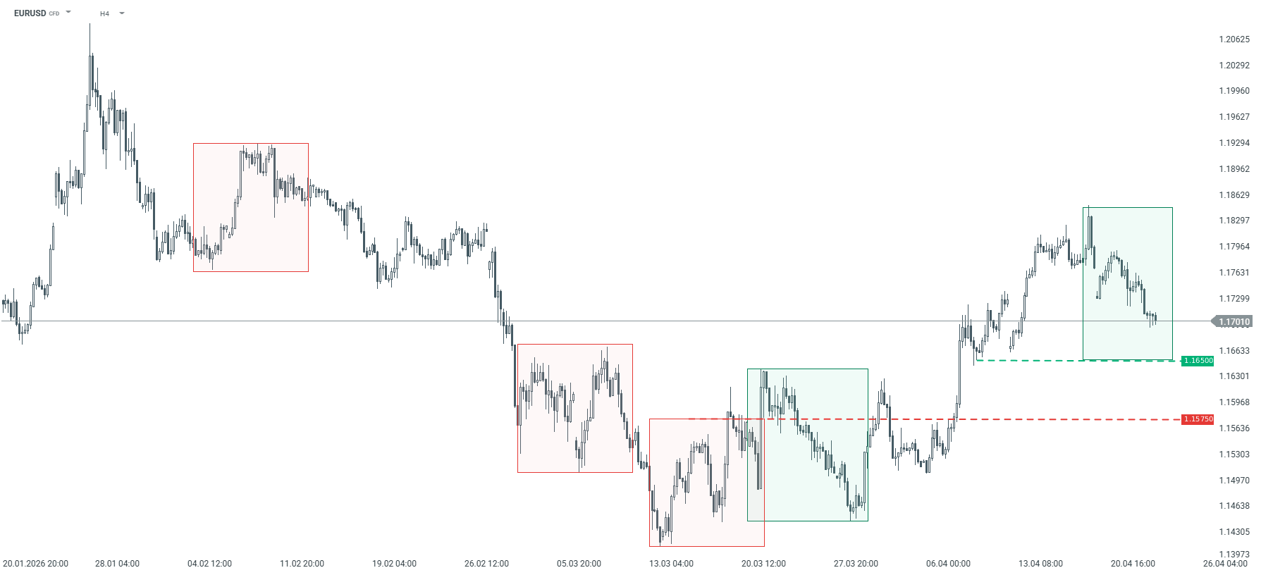 EURCAD – H4 timeframe. Source: xStation EURUSD Since mid-March, the EURUSD has been trending upward, but in recent days we have seen a downward correction. The price is approaching key support at the 1.1650 level, which stems from the lower boundary of the local 1:1 pattern. A potential bounce at this point could lead to the generation of another upward impulse. Conversely, a sustained break below the 1.1650 level would open the way for a return to the downtrend.