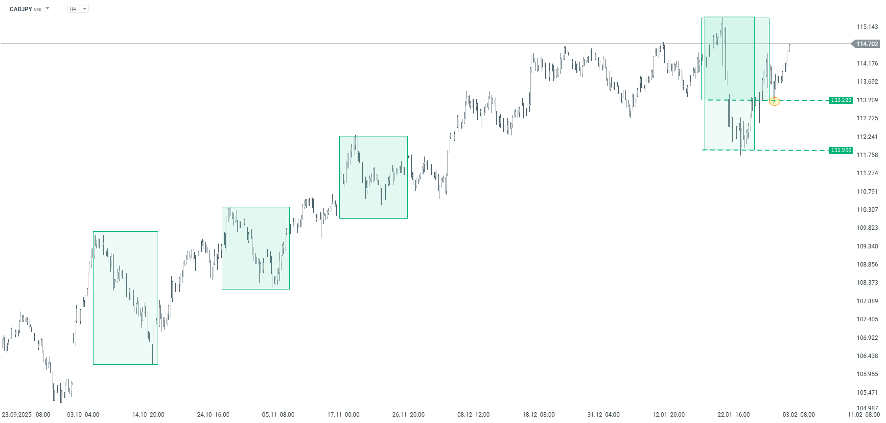 The CADJPY currency pair has been on an upward trend for quite some time. The latest correction had exactly the same range as the first correction in the trend, i.e. the correction in October last year, which fits into the classic Overbalance structure. In addition, the price returned above the polarity of the broken smaller 1:1 geometry at 113.22, which reinforces the scenario assuming a continuation of the upward movement.