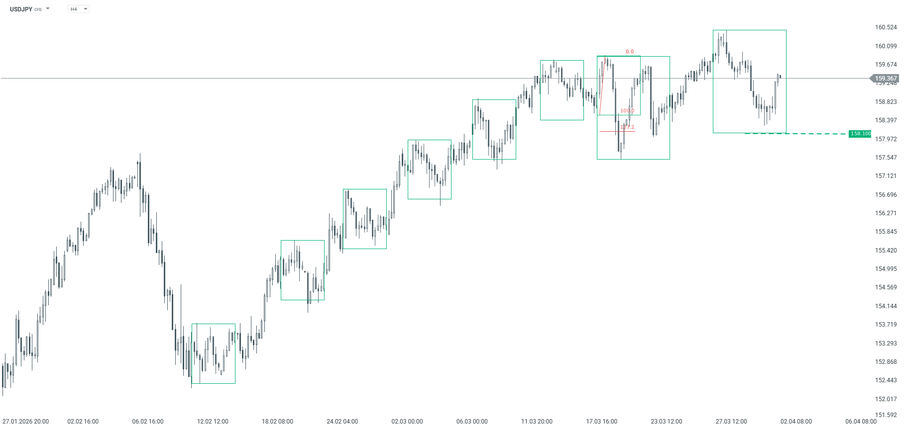 Since February 12, the USDJPY has been trading in a strong uptrend. Initially, the movement was controlled by a 1:1 corrective pattern with a range of approximately 140 pips; however, in mid-March, a deeper correction occurred, after which the market established a new high. As a result, the current largest corrective pattern has a range of approximately 240 pips. At this point, the key support level is 158.10, derived from the lower boundary of this pattern. As long as this level holds, the uptrend remains in place. A break below it, however, could open the way for a larger correction or even a trend reversal.