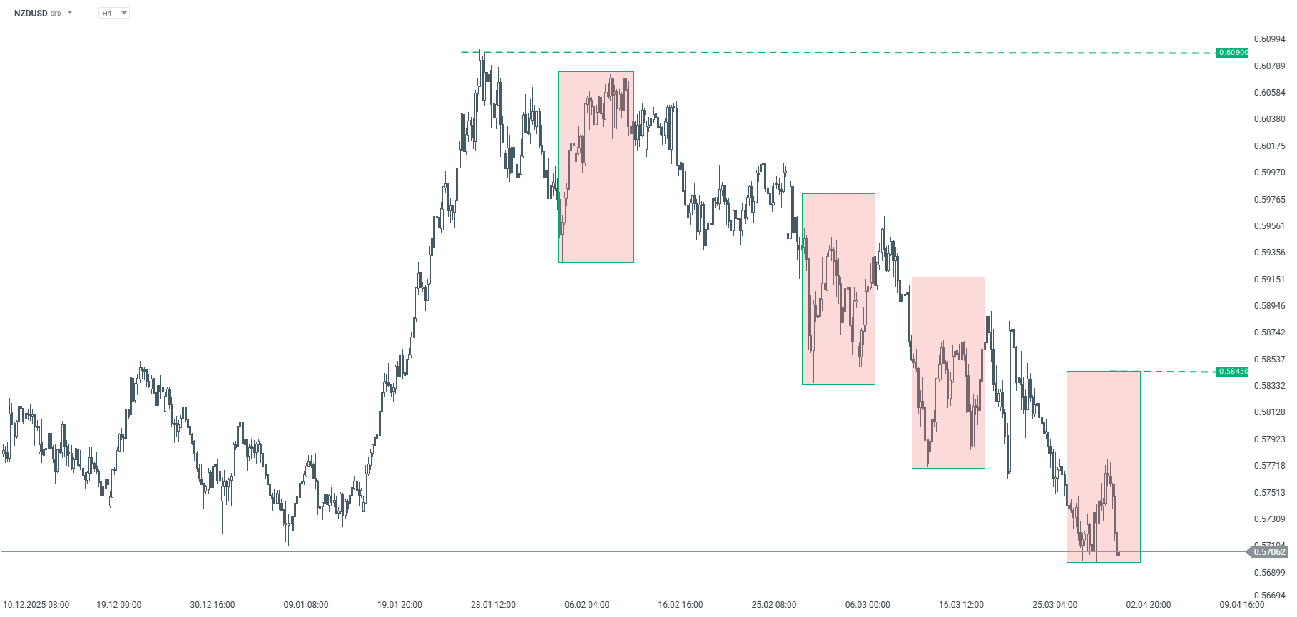 The NZDUSD pair has been trending downward since late January. We are currently seeing an upward corrective move. If the correction continues, the key resistance level remains at 0.5845, where the upper boundary of the 1:1 correction pattern is located. According to the Overbalance methodology, the downtrend remains in effect until this level is negated.