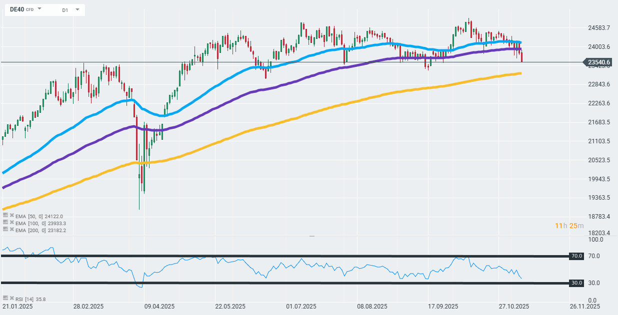 The DAX is clearly losing ground during Friday’s session and, crucially, is falling sharply below the 100-day exponential moving average (purple curve on the chart). This scenario causes the DE40 to negate the previous medium-term upward trend and creates the basis for further declines to around 200 -day EMA (gold curve), which was recently tested by the market during the biggest crash this year, namely in April, when we observed the peak of panic related to US customs policy. Source: xStation