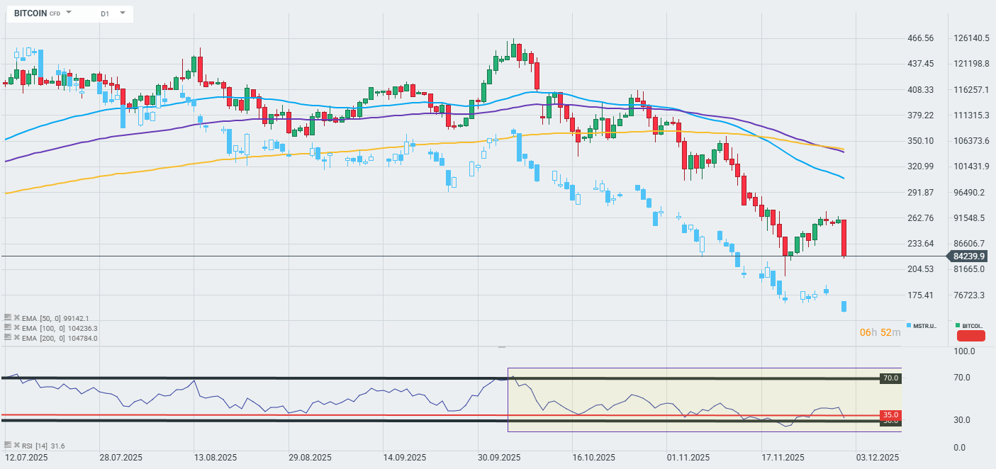 Bitcoin and Strategy shares are losing ground at the beginning of the week. The largest cryptocurrency is currently reaching local lows from 21 November. Source: xStation
