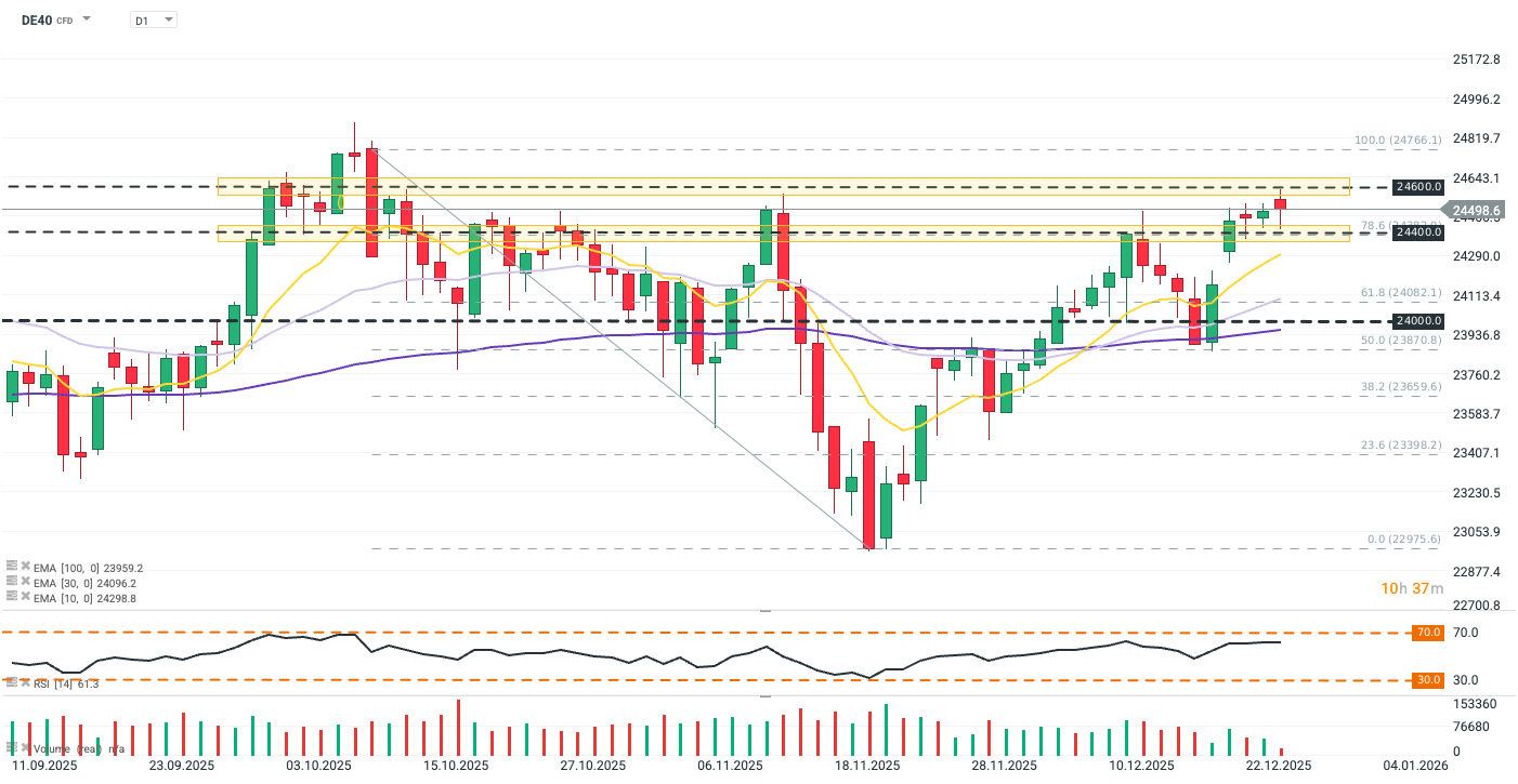 The DE40 contract maintains a strong bullish structure on the daily chart, trading well above its key exponential moving averages (EMA 10, 30, and 100). Currently, the price is testing the upper boundary of a significant zone near 24,484 points, supported by the 78.6% Fibonacci retracement level (24,400 pts).