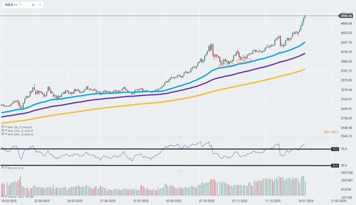 GOLD is currently trading at around $4,980 per ounce, while at its peak it reached almost $4,990. GOLD continues to follow an upward trend (50-, 100- and 200-day EMA). The returns are very fast, as shown by the RSI, which is above 82 points.