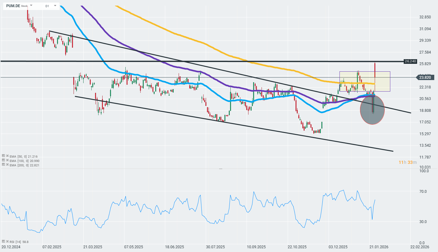 Puma SE (PUM.DE) shares are rising sharply today by more than 10% (to ~EUR 23.80) in response to the announcement of a landmark deal with Chinese sports giant Anta Sports Products. Anta has agreed to purchase 29.06% of Puma shares from the Pinault family (through the Artémis holding company) for EUR 1.51 billion (USD 1.8 billion), paying EUR 35 per share—a 62% premium to yesterday’s closing price of EUR 21.63. This deal makes Anta Puma’s largest shareholder, although the company has ruled out a full takeover. The market views the strategic support for Puma, which is struggling with declining sales and competition from Nike, Adidas and new players such as New Balance and Hoka, positively. Anta sees undervalued potential in Puma, especially in the Chinese market (only 7% of Puma’s revenue), and plans to gain seats on the board once the transaction is approved.