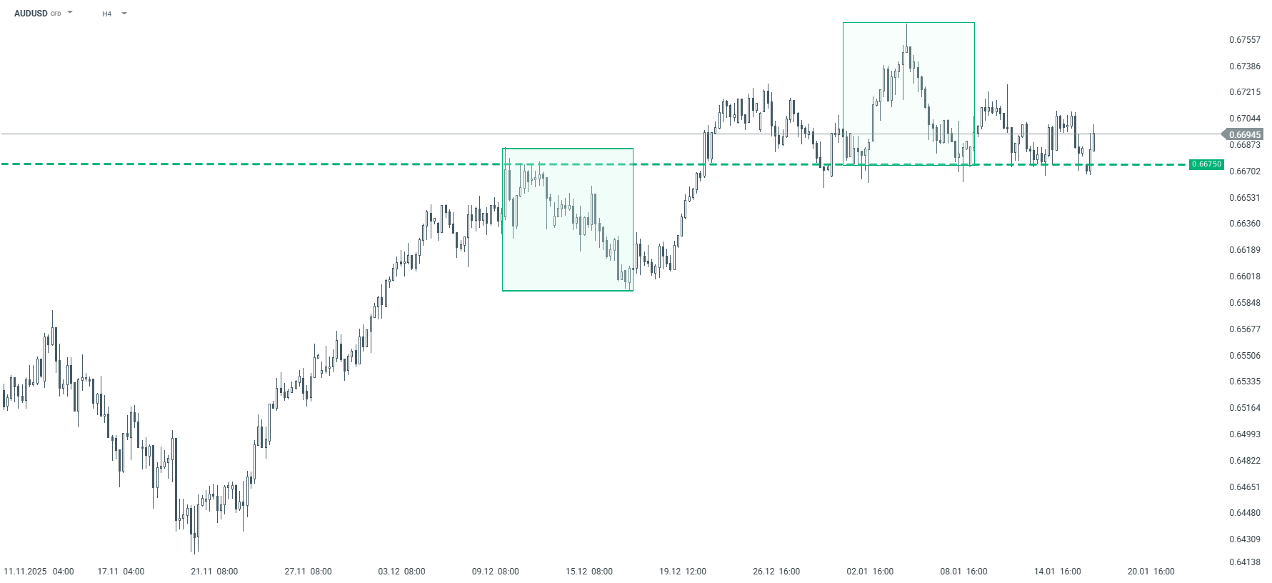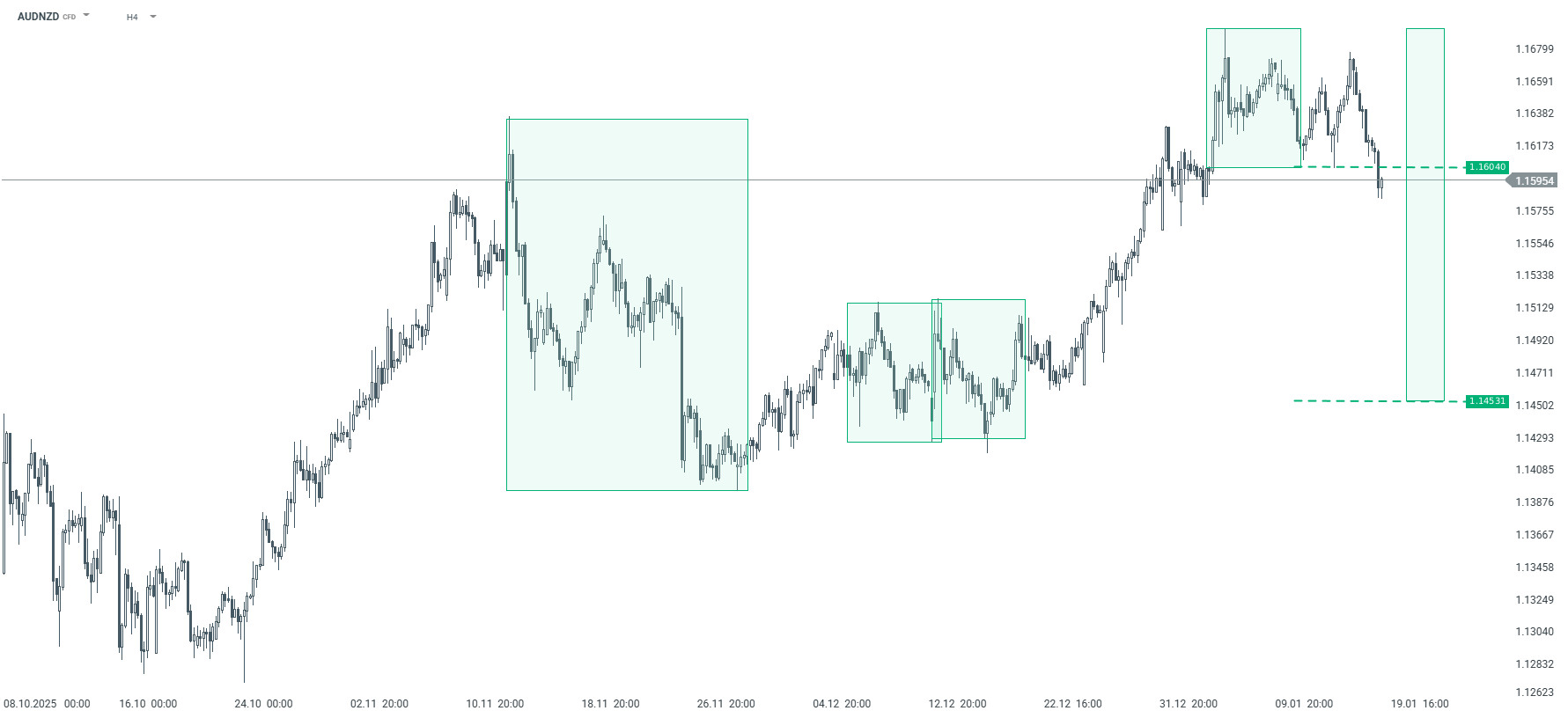The AUDNZD currency pair broke through support at 1.1604 overnight, which could result in a deeper downward correction. Comparing the current movement to the previous, larger correction, the next significant support is in the region of 1.1453. Only a sustained return above 1.1604 could restore the upward scenario.