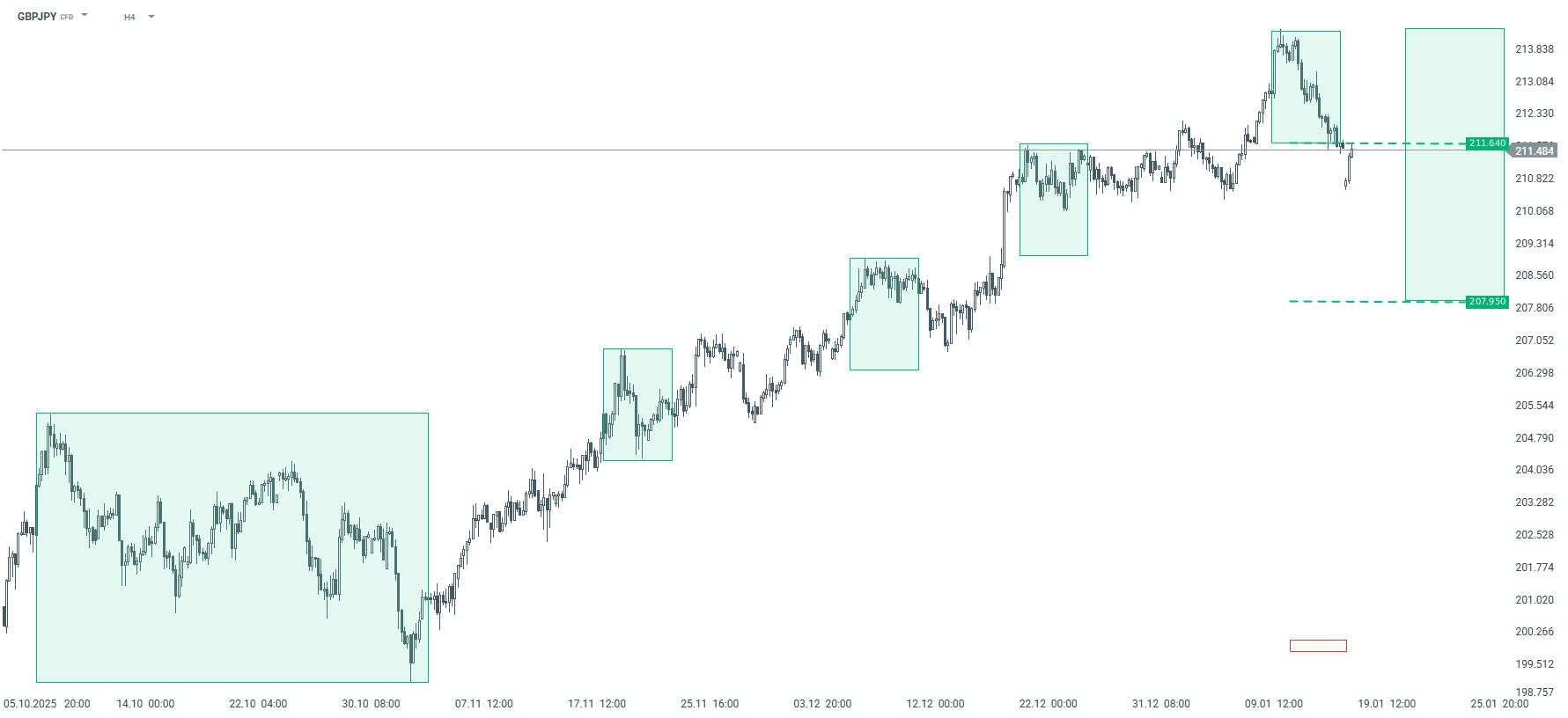 GBPJPY quotes negated support at 211.64 at the opening, which, according to the Overbalance methodology, may pave the way for a larger downward correction. In such a scenario, the key level remains the lower limit of the larger 1:1 pattern, which falls in the region of 207.95. Only a sustained return of the price above 211.64 could indicate a resumption of the upward movement.