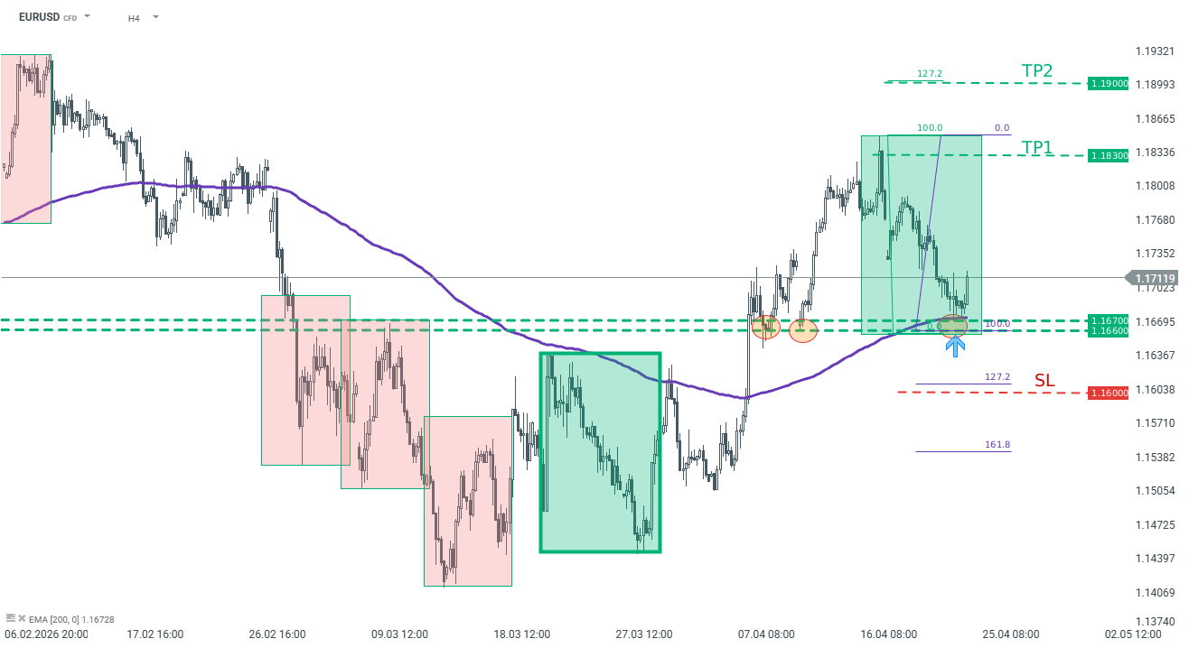 Opinion : EURUSD has been trading in an upward trend recently. Looking at the H4 interval, one can see that the recent downward correction reached the key support, where buyers appeared .The area 1.1660-1.1670 is marked with previous price reactions, 200-period moving average, as well as lower limit of 1:1 structure. According to the classic technical analysis and Overbalance methodology, continuation of the upward move looks to be the base case scenario. We recommend going long EURUSD at market price with two targets: 1.1830 and 1.1900. We also recommend placing a stop loss order at 1.1600. Source: xStation5