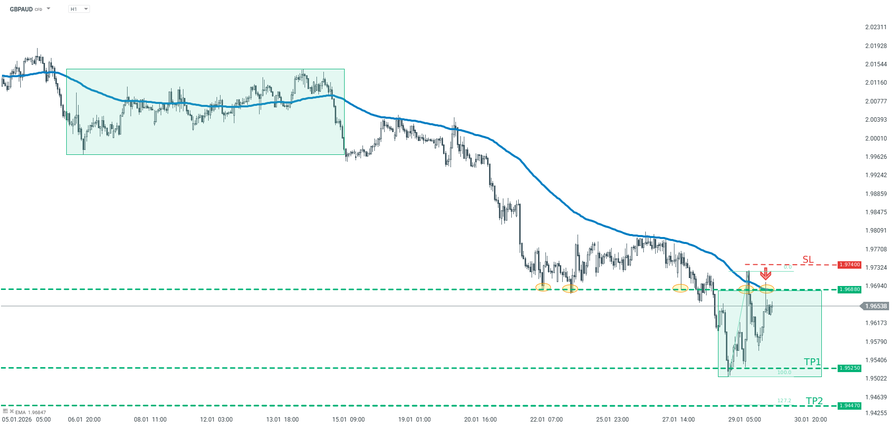Looking at the GBPAUD chart at the H1 interval, one can see that the price bounced off the key resistance.. The area near 1.9688 is marked with the upper limit of 1:1 structure, and previous price reactions, as well as 100-period moving average. According to the Overbalance strategy, as long as the price sits below, the main trend remains downward. We recommend going short GBPAUD at market price with two targets: 1.9525 and 1.9447. We also recommend placing a stop loss order at 1.9740. Source: xStation5