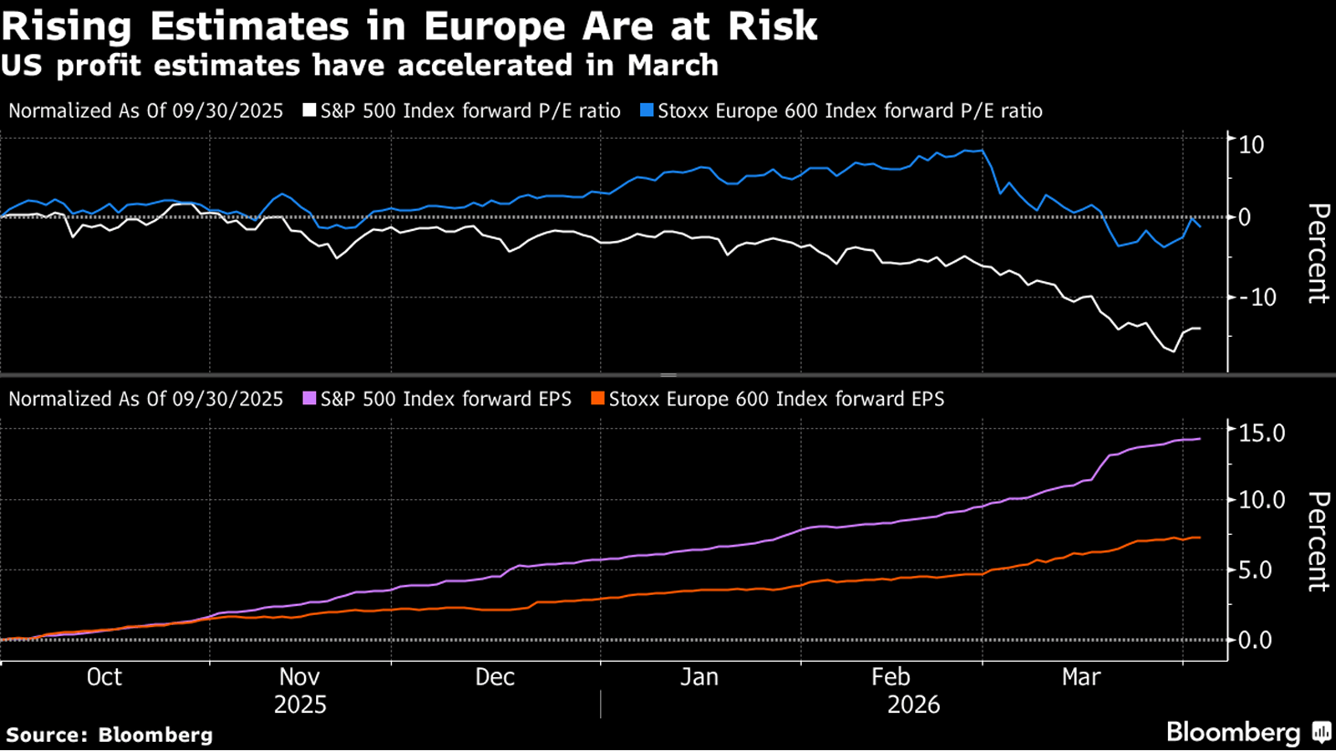 As the Bloomberg data above shows, U.S. stock indices have fallen much more sharply in recent months compared to their European counterparts, while earnings per share (EPS) revisions have risen much more slowly in Europe than for Wall Street companies during the same period. Source: Bloomberg Financial LP