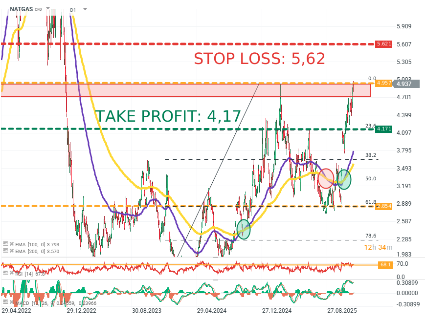 Opinion: The price of NATGAS has increased by over 75% in the last 3 months and has stopped at the level of 4.94, which during the upward wave at the beginning of 2025 and in 2017 proved to be a strong resistance zone, after which the price experienced a significant correction. The correction scenario is also supported by the RSI indicator, which is at a high level of 68. The MACD indicator, although above 0, shows the MACD line being crossed by the signal line from above, which is a classic signal of losing upward momentum. Fundamentally, the USA continues to increase production, inventories remain above the 5-year average, and the current consumption forecast indicates values about 5% less than last winter. The combination of trading under “momentum” (crossing EMA100 and EMA200) with the market discounting the impact of increased exports and Europe’s departure from Russian gas in 2026 has brought the price to levels optimal for a downward correction and the realization of a classic double top formation.