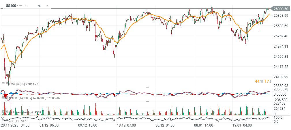 In addition, the weekly ADP employment change came in at 7.5k jobs, compared with 8k previously. Attention now turns to the Conference Board index and the Richmond Fed regional index, both due at 16:00. The US100 index is rising ahead of the U.S. market open and is approaching the key 26,000 level.