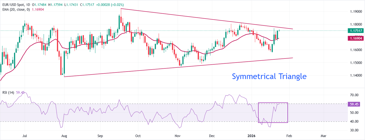 EUR/USD trades close to the three-week high of 1.1769 as of writing. The major currency pair trades within a Symmetrical Triangle on the daily chart, indicating broader volatility contraction. The price is close to the upper boundary of the volatility contraction pattern around 1.1770, which is plotted from the multi-year high of 1.1919 posted on September 17.